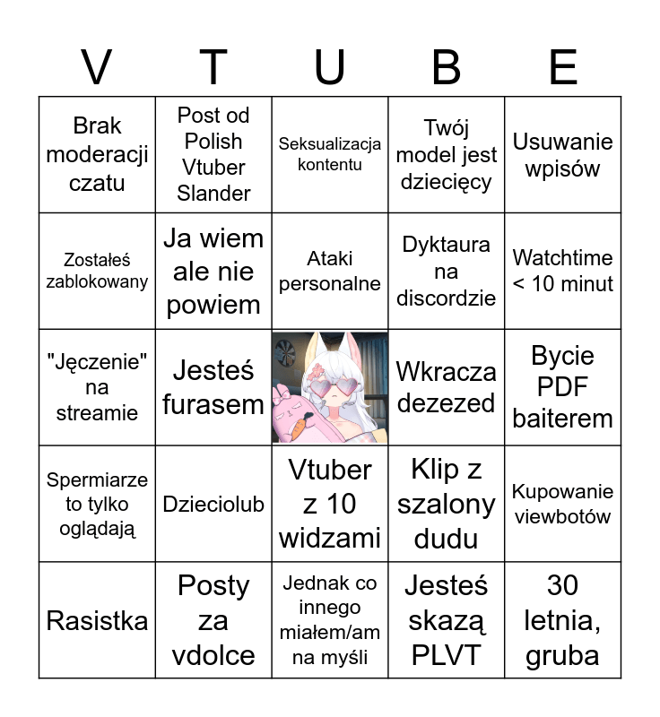 This bingo card has a free space and 24 words: Dzieciolub, Posty za vdolce, Ataki personalne, Rasistka, Usuwanie wpisów, Brak moderacji czatu, Zostałeś zablokowany, Post od Polish Vtuber Slander, Wkracza dezezed, Vtuber z 10 widzami, Dyktaura na discordzie, "Jęczenie" na streamie, Klip z szalony dudu, Kupowanie viewbotów, Ja wiem ale nie powiem, Jesteś skazą PLVT, Bycie PDF baiterem, Seksualizacja kontentu, Watchtime < 10 minut, Jesteś furasem, 30 letnia, gruba, Spermiarze to tylko oglądają, Twój model jest dziecięcy and Jednak co innego miałem/am na myśli.