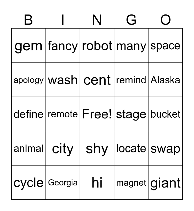 This bingo card has a free space and 24 words: city, Georgia, cent, cycle, space, gem, apology, fancy, stage, shy, remind, define, locate, swap, wash, magnet, bucket, robot, Alaska, remote, giant, animal, many and hi.