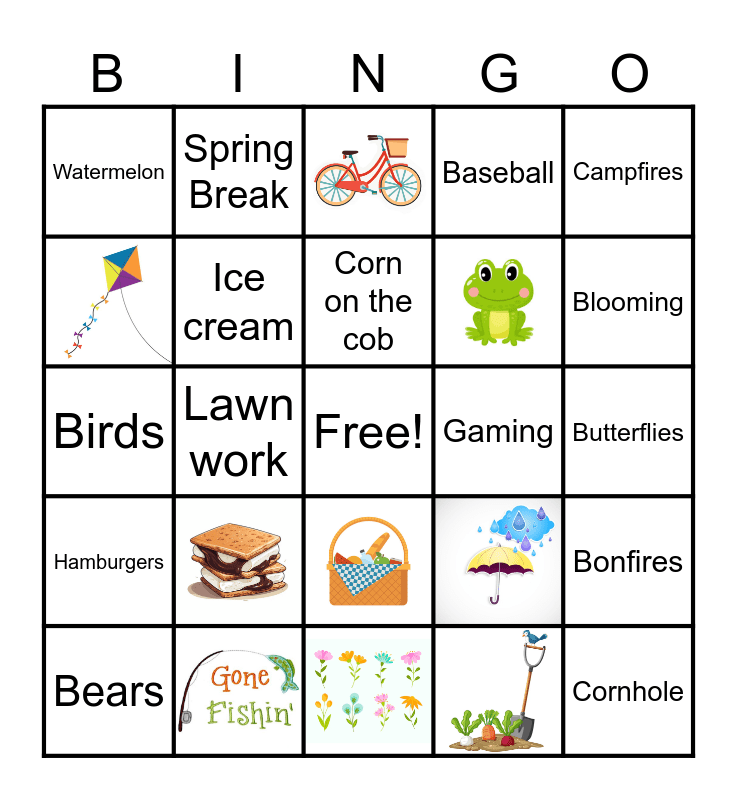 This bingo card has 9 images, a free space and 20 words: Bears, Cookies, Lawn work, Frisbee Golf, Watermelon, Ice cream, Gaming, Butterflies, Cornhole, Blooming, Long strolls, Hamburgers, Campfires, Birds, Fly Kites, Baseball, Spring Break, Bonfires, Corn on the cob and Pizza.