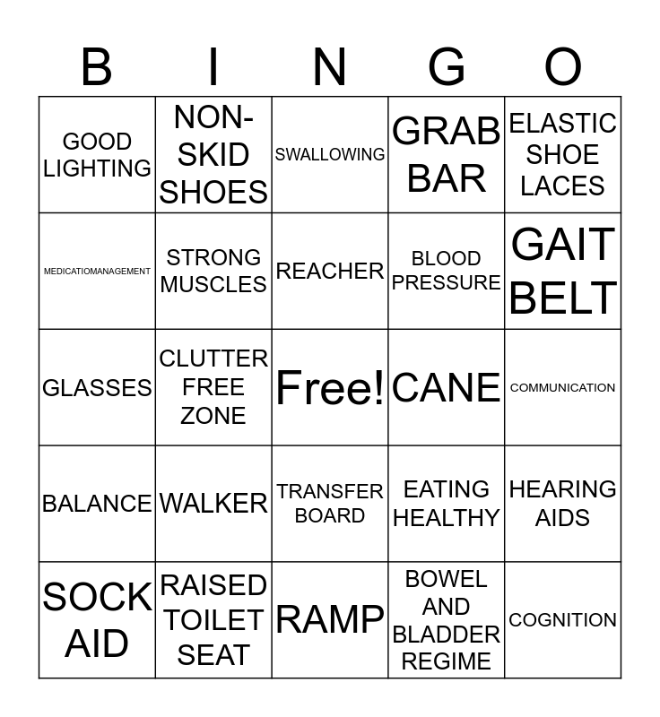 This bingo card has a free space and 24 words: WALKER, RAISED TOILET SEAT, REACHER, SOCK AID, ELASTIC SHOE LACES, GOOD LIGHTING, MEDICATIOMANAGEMENT, NON-SKID SHOES, CANE, TRANSFER BOARD, BLOOD PRESSURE, GLASSES, EATING HEALTHY, HEARING AIDS, STRONG MUSCLES, BOWEL AND BLADDER REGIME, COMMUNICATION, SWALLOWING, GAIT BELT, CLUTTER FREE ZONE, COGNITION, BALANCE, GRAB BAR and RAMP.