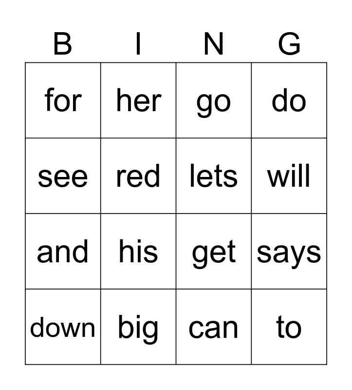 This bingo card has 19 words: get, up, go, to, says, see, can, for, her, and, his, red, lets, big, down, you, do, will and make.