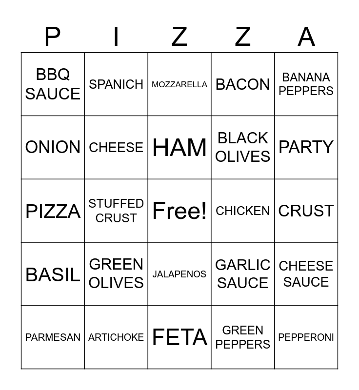 This bingo card has a free space and 29 words: PARMESAN, ANCHOVIES, STUFFED CRUST, PIZZA SAUCE, BBQ SAUCE, MOZZARELLA, CHEESE, GREEN OLIVES, CHICKEN, ARTICHOKE, CRUST, PEPPERONI, FETA, GREEN PEPPERS, PARTY, PINEAPPLE, JALAPENOS, BASIL, BANANA PEPPERS, PIZZA, GARLIC SAUCE, SAUSAGE, BLACK OLIVES, ONION, BACON, SPANICH, CHEESE SAUCE, HAM and MUSHROOMS.