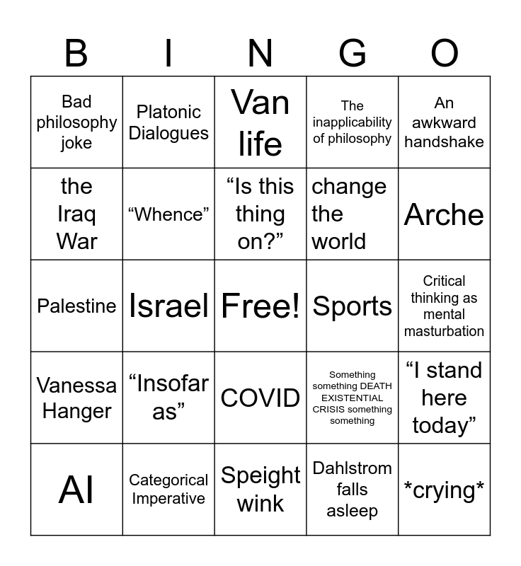 This bingo card has a free space and 24 words: “Insofar as”, Categorical Imperative, “Is this thing on?”, AI, An awkward handshake, Bad philosophy joke, the Iraq War, Platonic Dialogues, Sports, COVID, change the world, Palestine, Something something DEATH EXISTENTIAL CRISIS something something, “I stand here today”, “Whence”, Dahlstrom falls asleep, Critical thinking as mental masturbation, Van life, Arche, Israel, *crying*, Vanessa Hanger, The inapplicability of philosophy and Speight wink.