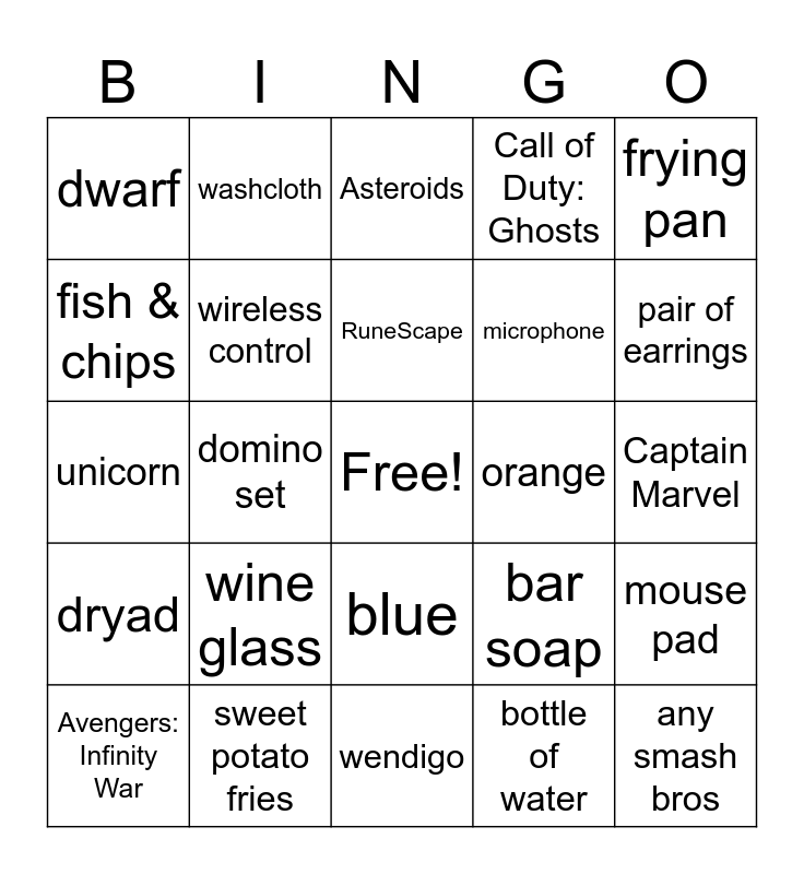 This bingo card has a free space and 24 words: wine glass, sweet potato fries, RuneScape, Avengers: Infinity War, frying pan, dwarf, fish & chips, washcloth, orange, blue, microphone, unicorn, bar soap, mouse pad, wireless control, bottle of water, Captain Marvel, Asteroids, pair of earrings, domino set, any smash bros, dryad, Call of Duty: Ghosts and wendigo.