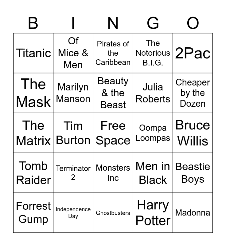 This bingo card has a free space and 24 words: Terminator 2, Independence Day, Beauty & the Beast, Forrest Gump, 2Pac, Titanic, The Mask, Of Mice & Men, Oompa Loompas, Monsters Inc, Julia Roberts, The Matrix, Men in Black, Beastie Boys, Marilyn Manson, Harry Potter, Bruce Willis, Pirates of the Caribbean, Cheaper by the Dozen, Tim Burton, Madonna, Tomb Raider, The Notorious B.I.G. and Ghostbusters.