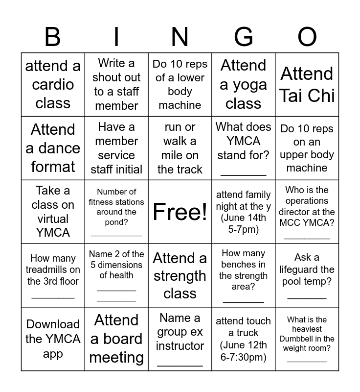 This bingo card has a free space and 35 words: 20 minute Nutrition Consultation, 20 minute Wellbeing Consultation, Fitness Assessment or Fitness Checkpoint, Have a member service staff initial, Attend a strength class, Attend a yoga class, Attend a dance format, create a matrix log in, run or walk a mile on the track, walk or run a mile around the pond, Take a class on virtual YMCA, Attend Tai Chi, Meet 3 new people _______ _______ _______, refer or bring a friend, attend a cardio class, attend family night at the y (June 14th 5-7pm), attend touch a truck (June 12th 6-7:30pm), Number of fitness stations around the pond? ___________, How many treadmills on the 3rd floor ________, What is the heaviest Dumbbell in the weight room? _________, How many benches in the strength area? ________, Download the YMCA app, Ask a lifeguard the pool temp? _______, Attend a board meeting, Do 10 reps of a lower body machine, Do 10 reps on an upper body machine, When did the YMCA move into the Maplewood community center?, Do a balance assessment, What does YMCA stand for? _______, Who is the operations director at the MCC YMCA? _________, Name a personal Trainer ______, Name a group ex instructor _______, Name 2 of the 5 dimensions of health ________ ________, Write a shout out to a staff member and name 2 of the YMCA core values _______ _______.