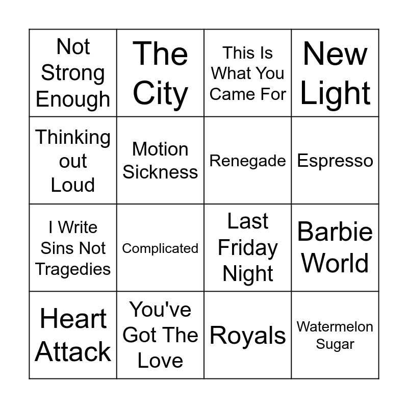 This bingo card has 26 words: The Wire, Hands To Myself, Espresso, Single Ladies, Thinking out Loud, Not Strong Enough, Motion Sickness, The City, Royals, Summertime Sadness, I Write Sins Not Tragedies, Last Friday Night, Circles, good 4 u, Barbie World, Burnin' Up, New Light, Watermelon Sugar, This Is What You Came For, Heart Attack, Complicated, Still into You, You've Got The Love, Skinny Love, Renegade and Famous.