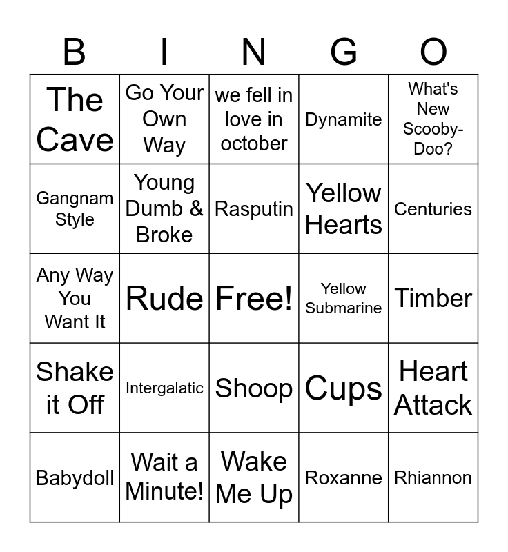 This bingo card has a free space and 44 words: Here Comes the Sun, Rhiannon, It's the End of the World as We Know It, Babydoll, Bad Habit, Roxanne, we fell in love in october, Bye Bye Bye, What's New Scooby-Doo?, Wait a Minute!, Dynamite, Yellow Submarine, Shoop, Intergalatic, Pompeii, Wake Me Up, All Star, Any Way You Want It, Eye of the Tiger, Centuries, Go Your Own Way, Since U Been Gone, Crazy, The Cave, Ho Hey, Timber, Somebody to Love, Wouldn't it Be Nice, Cups, Shake it Off, Sucker, Heart Attack, Clarity, Waterfalls, Rude, Cupid Shuffle, Dance Monkey, Hey Ya!, Rasputin, Gangnam Style, Yellow Hearts, Sunday Best, Young Dumb & Broke and Fast Car.