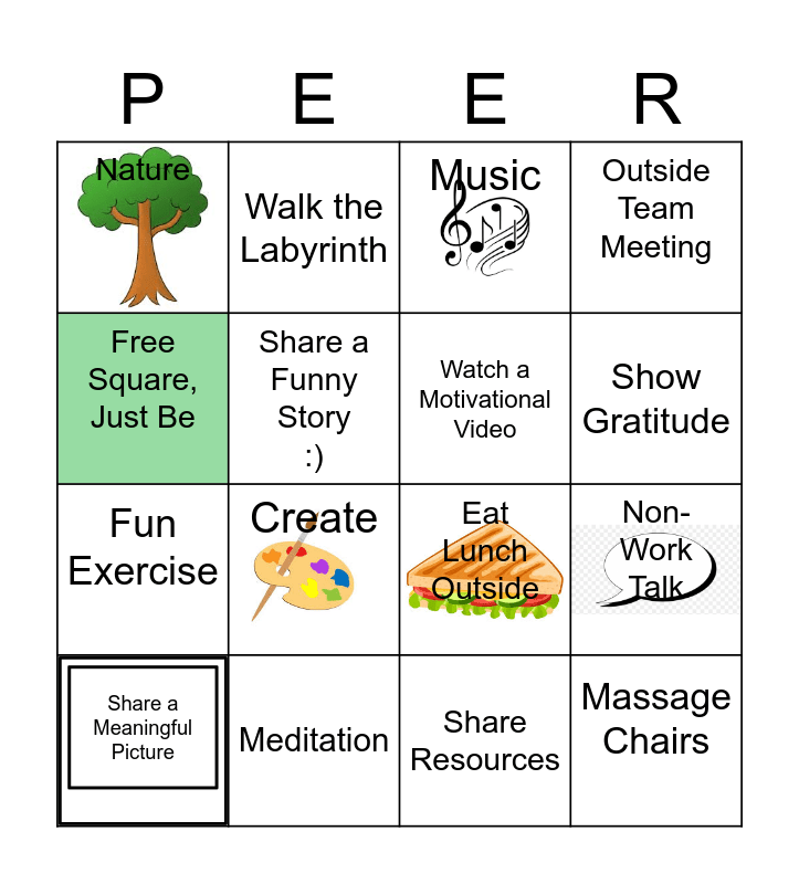 This bingo card has 6 images and 16 words: Meditation, Non-Work Talk, Music, Nature, Fun Exercise, Walk the Labyrinth, Eat Lunch Outside, Share Resources, Free Square, Just Be, Share a Funny Story :), Share a Meaningful Picture, Outside Team Meeting, Create, Show Gratitude, Watch a Motivational Video and Massage Chairs.