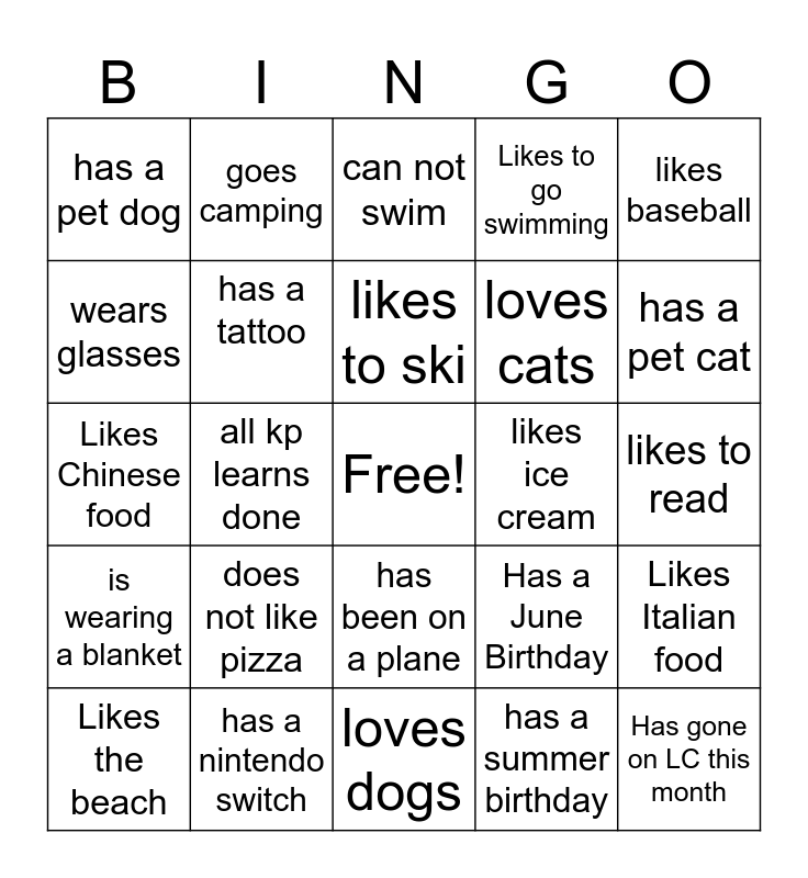This bingo card has a free space and 24 words: does not like pizza, has a nintendo switch, likes to ski, Likes the beach, likes baseball, has a pet dog, wears glasses, goes camping, likes ice cream, has been on a plane, loves cats, Likes Chinese food, Has a June Birthday, Likes Italian food, has a tattoo, has a summer birthday, likes to read, can not swim, has a pet cat, all kp learns done, Has gone on LC this month, is wearing a blanket, Likes to go swimming and loves dogs.