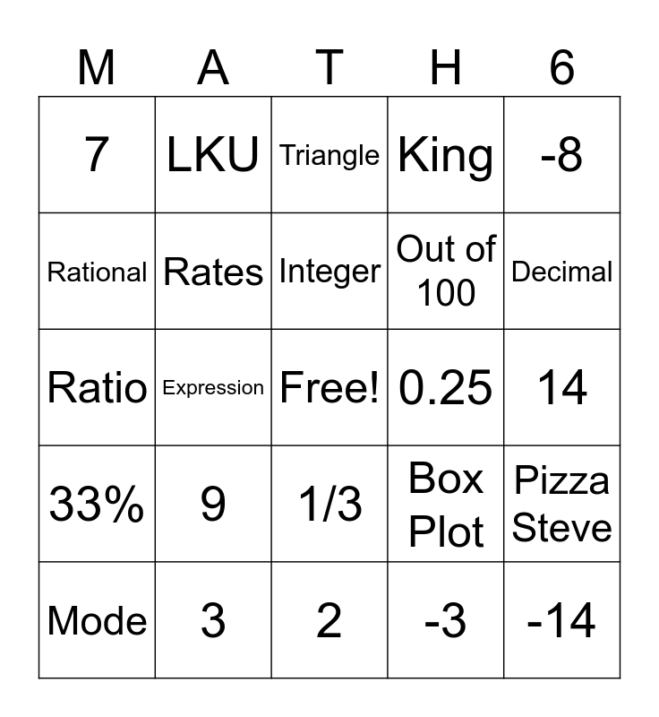 This bingo card has a free space and 74 words: Area, Volume, Triangle, Trapezoid, Prism, Parallelogram, Mean, Median, Mode, Range, Coordinates, Coordinate Grid, Integer, Rational, Equation, Expression, Fraction, Decimal, Percent, Ratio, Rates, LKU, King, -15, -14, -13, -12, -11, -10, -9, -8, -7, -6, -5, -4, -3, -2, -1, 0, 1, 2, 3, 4, 5, 6, 7, 8, 9, 10, 11, 12, 13, 14, 15, 1/8, 1/5, 1/3, 1/4, Scoreboard, Pizza Steve, Out of 100, 25%, 33%, 0.33, 0.25, Texas 2 Step, Double # Lines, Desmos, Box Plot, Dot Plot, -16, 16, -20 and 20.