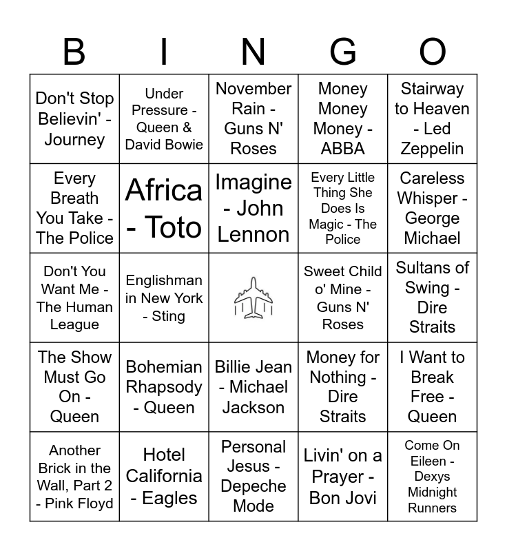 This bingo card has a free space and 24 words: Bohemian Rhapsody - Queen, Hotel California - Eagles, Imagine - John Lennon, Another Brick in the Wall, Part 2 - Pink Floyd, Stairway to Heaven - Led Zeppelin, Don't Stop Believin' - Journey, Every Breath You Take - The Police, Under Pressure - Queen & David Bowie, Sweet Child o' Mine - Guns N' Roses, Billie Jean - Michael Jackson, Every Little Thing She Does Is Magic - The Police, Don't You Want Me - The Human League, Money for Nothing - Dire Straits, I Want to Break Free - Queen, Africa - Toto, Livin' on a Prayer - Bon Jovi, Sultans of Swing - Dire Straits, November Rain - Guns N' Roses, Careless Whisper - George Michael, Englishman in New York - Sting, Come On Eileen - Dexys Midnight Runners, The Show Must Go On - Queen, Money Money Money - ABBA and Personal Jesus - Depeche Mode.