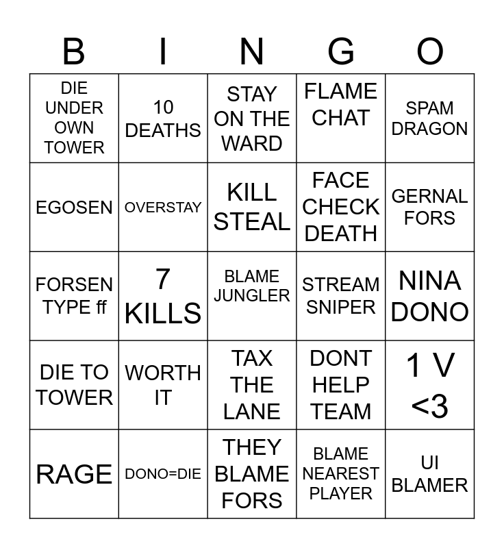 This bingo card has 25 words: DIE TO TOWER, DONO=DIE, BLAME JUNGLER, BLAME NEAREST PLAYER, SPAM DRAGON, DIE UNDER OWN TOWER, 10 DEATHS, STAY ON THE WARD, STREAM SNIPER, 1 V <3, EGOSEN, OVERSTAY, THEY BLAME FORS, DONT HELP TEAM, GERNAL FORS, RAGE, 7 KILLS, KILL STEAL, FACE CHECK DEATH, NINA DONO, FORSEN TYPE ff, WORTH IT, TAX THE LANE, FLAME CHAT and UI BLAMER.