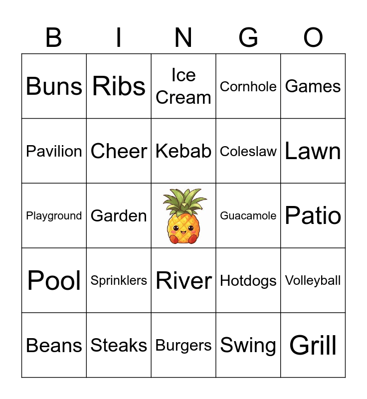 This bingo card has a free space and 57 words: BBQ, Beans, Bench, Buns, Burgers, Charcoal, Cheer, Chips, Coleslaw, Corn, Cornhole, Feast, Fireworks, Flip-Flops, Frisbee, Fun, Games, Garden, Gazebo, Grill, Guacamole, Hat, Hotdogs, Ice Cream, Iced Tea, Kebab, Ketchup, Lake, Lawn, Lemonade, Music, Mustard, Outdoors, Park, Patio, Pavilion, Picnic, Playground, Pond, Pool, Ribs, River, S’mores, Salsa, Shades, Skewers, Sprinklers, Steaks, Summer, Sun, Sunshine, Swing, Tan, Tongs, Trails, Volleyball and Watermelon.