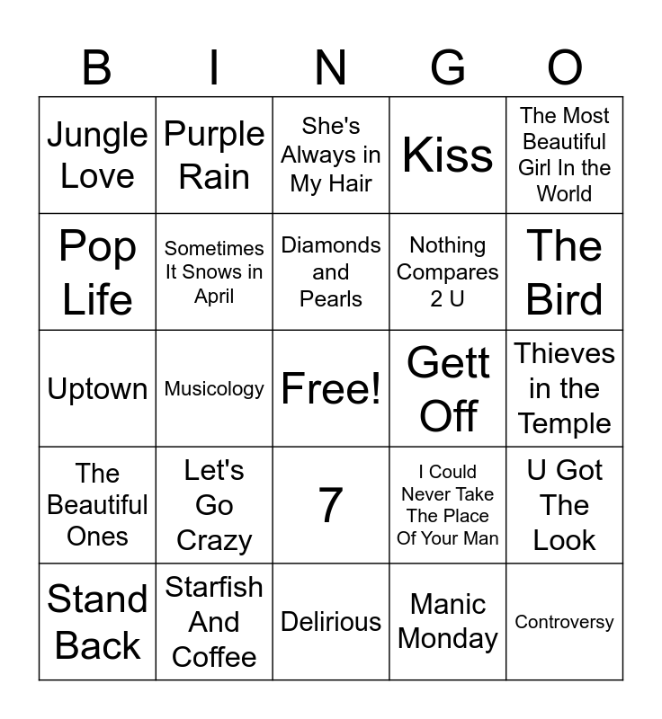 This bingo card has a free space and 50 words: I Wanna Be Your Lover, Controversy, 1999, Delirious, Let's Go Crazy, When Doves Cry, Purple Rain, Raspberry Beret, Pop Life, Girls & Boys, Sometimes It Snows in April, Kiss, U Got The Look, I Could Never Take The Place Of Your Man, Partyman, Batdance, Diamonds and Pearls, Gett Off, My Name Is Prince, The Most Beautiful Girl In the World, Musicology, Manic Monday, Jungle Love, Nothing Compares 2 U, I Feel for You, The Glamorous Life, The Bird, If I Was Your Girlfriend, She's Always in My Hair, 7, Little Red Corvette, I Would Die 4 U, Baby I'm a Star, Anotherloverholenyohead, Starfish And Coffee, Adore, Housequake, Hot Thing, Alphabet St., Thieves in the Temple, Cream, The Morning Papers, Take Me with U, A Love Bizarre, Stand Back, Uptown, When You Were Mine, Sign O' The Times, The Beautiful Ones and The Holy River.