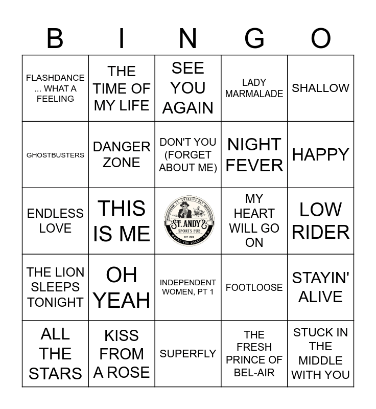 This bingo card has a free space and 50 words: (EVERYTHING I DO) I DO IT FOR YOU, STUCK IN THE MIDDLE WITH YOU, UNCHAINED MELODY, SUPERFLY, OH YEAH, 9 TO 5, THE TIME OF MY LIFE, I WILL ALWAYS LOVE YOU, GHOSTBUSTERS, SCHOOL'S OUT, DANGER ZONE, LADY MARMALADE, STAYIN' ALIVE, FOOTLOOSE, OVER THE RAINBOW, EYE OF THE TIGER, DON'T YOU (FORGET ABOUT ME), MY HEART WILL GO ON, LOSE YOURSELF, SHALLOW, THIS IS ME, THE FRESH PRINCE OF BEL-AIR, FLASHDANCE ... WHAT A FEELING, NIGHT FEVER, YOU'RE THE ONE THAT I WANT, SUNFLOWER, HAPPY, GANGSTA'S PARADISE, SEE YOU AGAIN, INDEPENDENT WOMEN, PT 1, WHEN DOVES CRY, I'LL BE THERE FOR YOU, YOU'VE GOT A FRIEND IN ME, WHERE EVERYBODY KNOWS YOUR NAME, KISS FROM A ROSE, MANIAC, I BELIEVE I CAN FLY, CAR WASH, MEN IN BLACK, LOW RIDER, I AM A MAN OF CONSTANT SORROW, STAND BY ME, THE POWER OF LOVE, KOKOMO, ALL THE STARS, ENDLESS LOVE, HOW DEEP IS YOUR LOVE, WE WILL ROCK YOU, THE LION SLEEPS TONIGHT and KUNG FU FIGHTING.