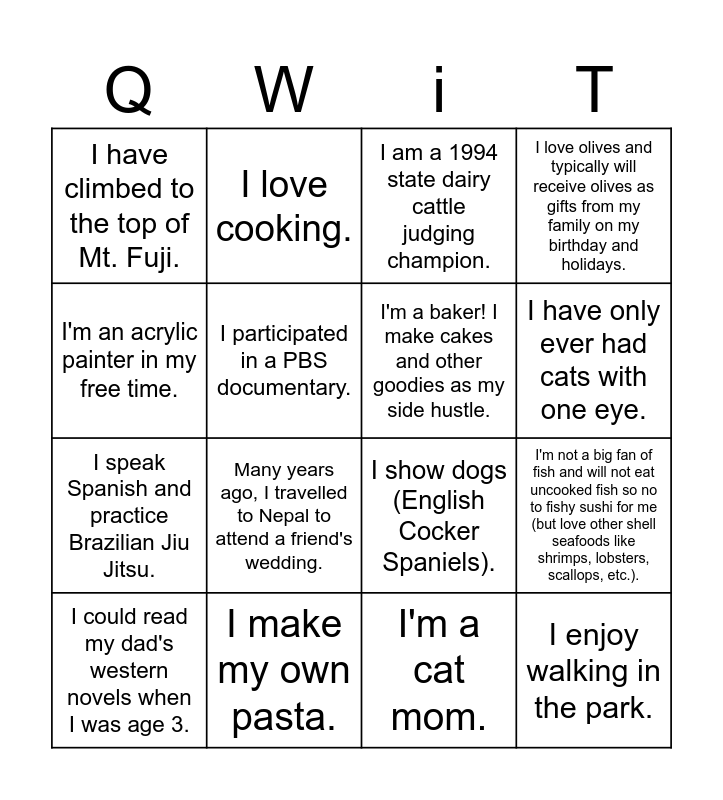 This bingo card has 18 words: Many years ago, I travelled to Nepal to attend a friend's wedding., I enjoy walking in the park., I am a 1994 state dairy cattle judging champion., I have climbed to the top of Mt. Fuji., I show dogs (English Cocker Spaniels)., I love olives and typically will receive olives as gifts from my family on my birthday and holidays., I could read my dad's western novels when I was age 3., I love cooking., I have only ever had cats with one eye., I speak Spanish and practice Brazilian Jiu Jitsu., I'm a cat mom., I'm an acrylic painter in my free time., I'm not a big fan of fish and will not eat uncooked fish so no to fishy sushi for me (but love other shell seafoods like shrimps, lobsters, scallops, etc.)., I participated in a PBS documentary., I'm a baker! I make cakes and other goodies as my side hustle., I’m the middle child of family of 5! I have one of each type of sibling (an older brother, an older sister, a younger sister, and a younger brother)., I make my own pasta. and I don't eat the marshmallows in Lucky Charms..