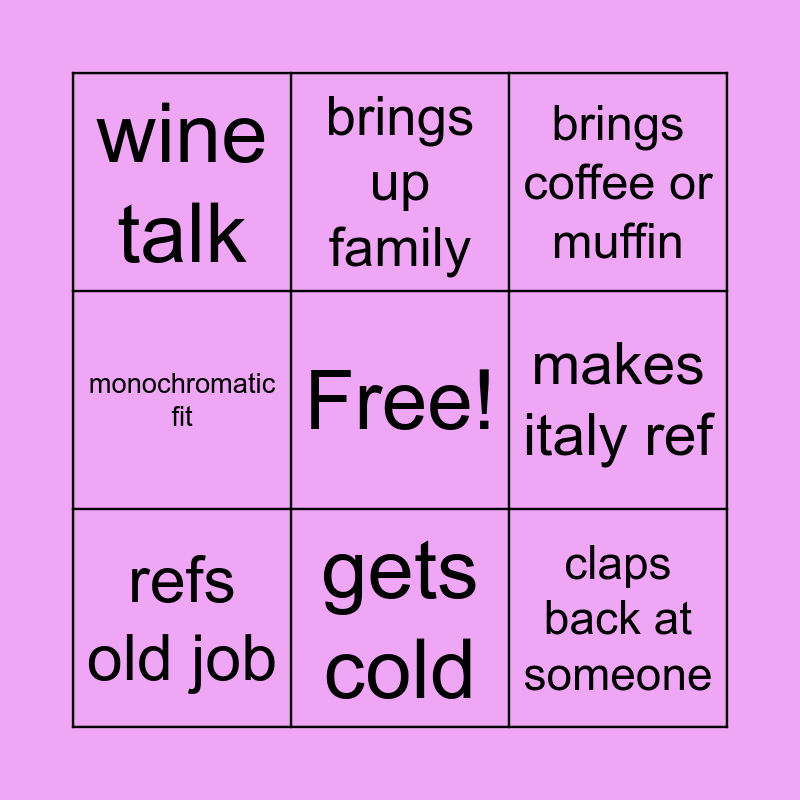 This bingo card has a free space and 8 words: makes italy ref, brings coffee or muffin, brings up family, refs old job, wine talk, claps back at someone, monochromatic fit and gets cold.
