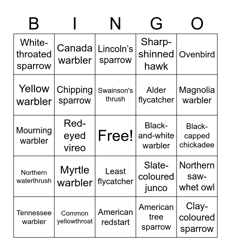 This bingo card has a free space and 25 words: Myrtle warbler, American redstart, Swainson's thrush, Tennessee warbler, Ovenbird, White-throated sparrow, Yellow warbler, Canada warbler, Black-and-white warbler, Least flycatcher, Alder flycatcher, Mourning warbler, Slate-coloured junco, Northern saw-whet owl, Chipping sparrow, Orange-crowned warbler, Black-capped chickadee, Lincoln’s sparrow, Magnolia warbler, Red-eyed vireo, Clay-coloured sparrow, Common yellowthroat, Northern waterthrush, Sharp-shinned hawk and American tree sparrow.