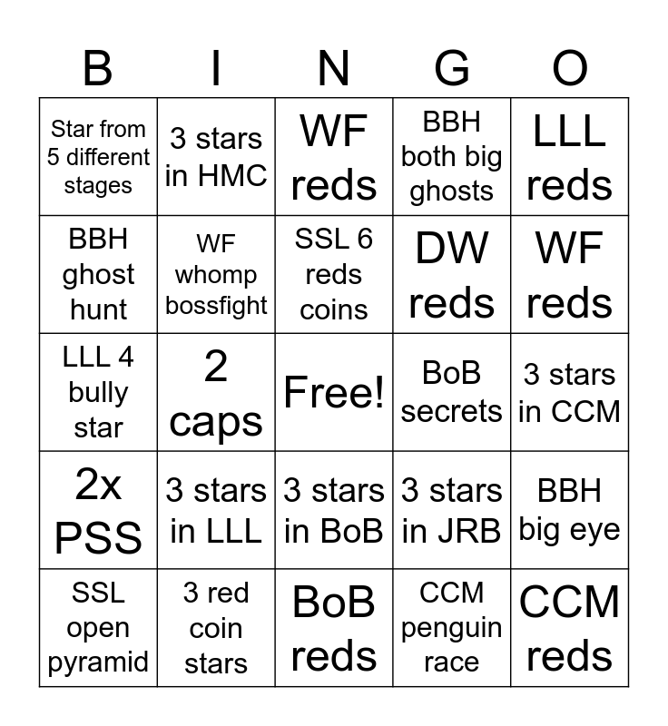 This bingo card has a free space and 30 words: 3 red coin stars, 2 stars in a box, 2 caps, Open 3 cannons, Star from 5 different stages, WF reds, WF whomp bossfight, 3 stars in BoB, BoB secrets, BoB reds, 3 stars in CCM, CCM reds, CCM penguin race, 3 stars in WF, WF reds, WF 100, 3 stars in JRB, 2x PSS, 3 stars in LLL, LLL reds, LLL 4 bully star, 3 stars in SSL, 3 stars in HMC, DW reds, BBH ghost hunt, BBH both big ghosts, BBH big eye, SSL open pyramid, SSL 6 reds coins and HMC 3 stars.