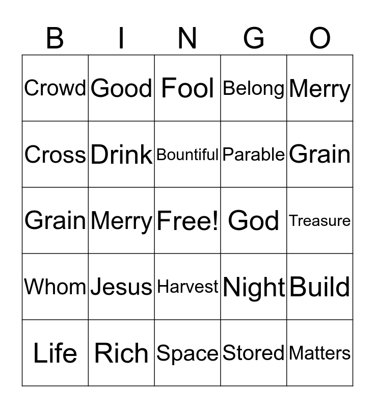 This bingo card has a free space and 24 words: Jesus, Rich, Bountiful, Life, Merry, Crowd, Cross, Good, God, Harvest, Parable, Grain, Night, Build, Drink, Stored, Treasure, Fool, Grain, Merry, Matters, Whom, Belong and Space.