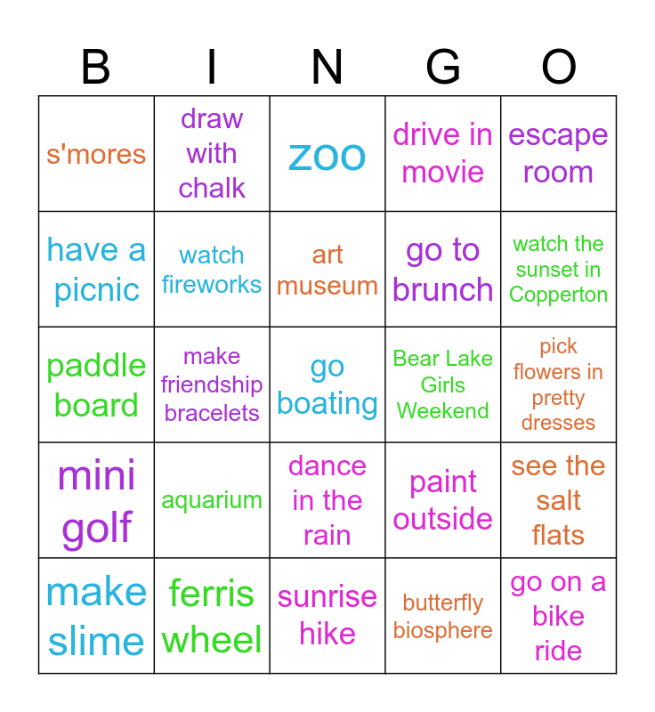 This bingo card has 25 words: aquarium, sunrise hike, art museum, make slime, escape room, s'mores, have a picnic, draw with chalk, Bear Lake Girls Weekend, dance in the rain, go to brunch, paddle board, paint outside, see the salt flats, watch fireworks, go on a bike ride, pick flowers in pretty dresses, zoo, watch the sunset in Copperton, make friendship bracelets, go boating, ferris wheel, mini golf, drive in movie and butterfly biosphere.