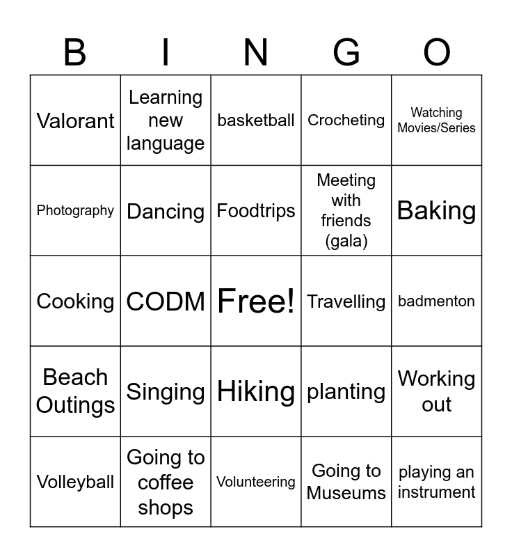 This bingo card has a free space and 29 words: Volleyball, walking, CODM, Mobile Legends, Valorant, basketball, Dancing, Singing, Travelling, Going to coffee shops, badmenton, playing an instrument, Volunteering, Going to Museums, Baking, Chess, Hiking, Beach Outings, Watching Movies/Series, Cooking, planting, Reading, Meeting with friends (gala), Photography, Crocheting, Learning new language, Working out, Foodtrips and Painting/Drawring.