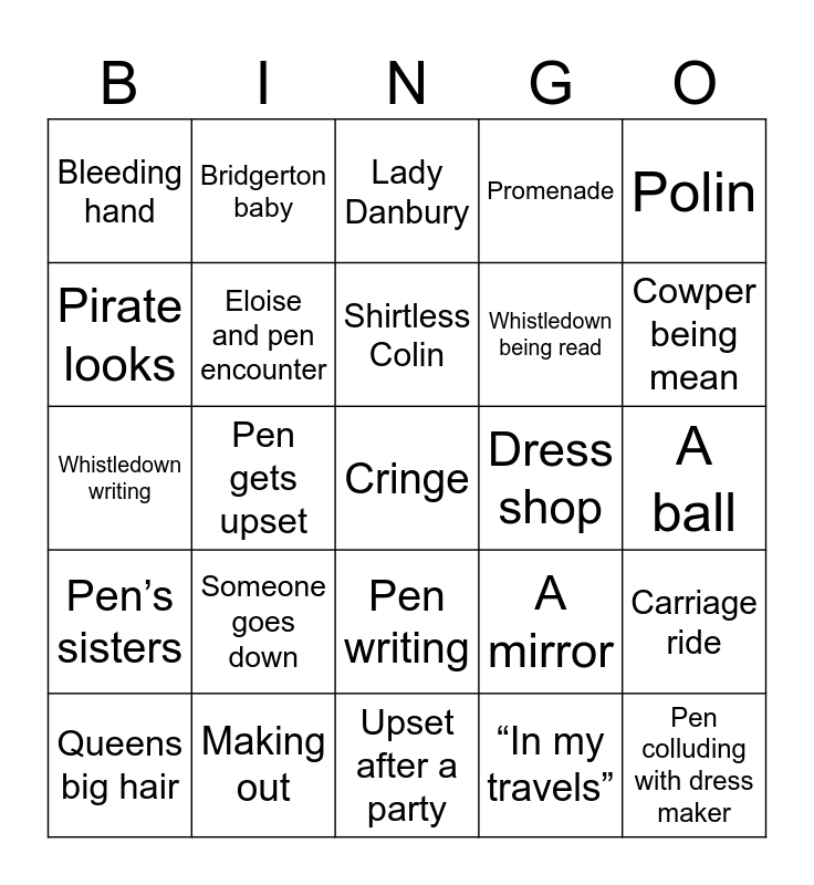 This bingo card has a free space and 24 words: Someone goes down, Making out, Shirtless Colin, Queens big hair, Polin, Bleeding hand, Pirate looks, Bridgerton baby, Dress shop, Pen writing, Whistledown being read, Whistledown writing, A mirror, Carriage ride, Eloise and pen encounter, “In my travels”, A ball, Lady Danbury, Cowper being mean, Pen gets upset, Pen colluding with dress maker, Pen’s sisters, Promenade and Upset after a party.
