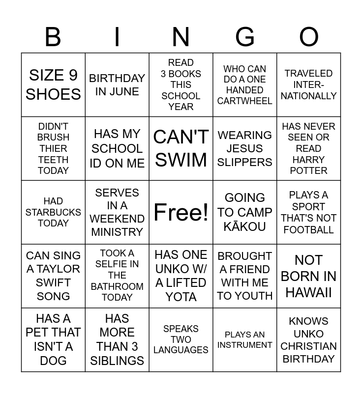 This bingo card has a free space and 24 words: TOOK A SELFIE IN THE BATHROOM TODAY, HAS MORE THAN 3 SIBLINGS, CAN'T SWIM, HAS A PET THAT ISN'T A DOG, TRAVELED INTER-NATIONALLY, SIZE 9 SHOES, DIDN'T BRUSH THIER TEETH TODAY, BIRTHDAY IN JUNE, GOING TO CAMP KĀKOU, HAS ONE UNKO W/ A LIFTED YOTA, WEARING JESUS SLIPPERS, HAD STARBUCKS TODAY, BROUGHT A FRIEND WITH ME TO YOUTH, NOT BORN IN HAWAII, HAS MY SCHOOL ID ON ME, PLAYS AN INSTRUMENT, PLAYS A SPORT THAT'S NOT FOOTBALL, READ 3 BOOKS THIS SCHOOL YEAR, HAS NEVER SEEN OR READ HARRY POTTER, SERVES IN A WEEKEND MINISTRY, KNOWS UNKO CHRISTIAN BIRTHDAY, CAN SING A TAYLOR SWIFT SONG, WHO CAN DO A ONE HANDED CARTWHEEL and SPEAKS TWO LANGUAGES.