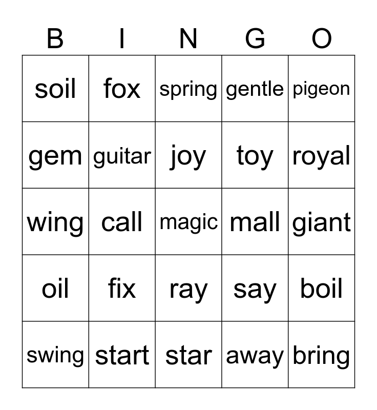 This bingo card has a free space and 24 words: fix, start, joy, swing, pigeon, soil, gem, fox, mall, ray, toy, wing, say, boil, guitar, away, giant, spring, royal, call, bring, oil, gentle and star.