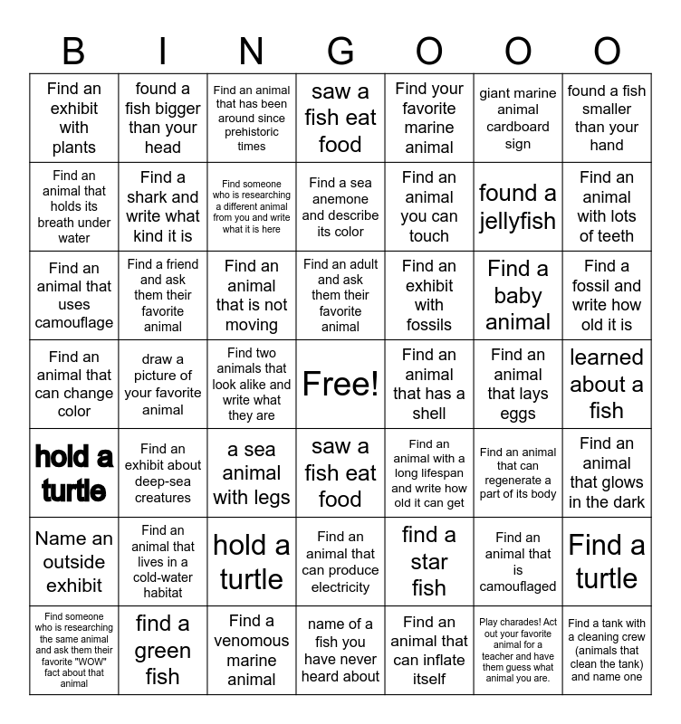 This bingo card has a free space and 48 words: find a star fish, found a jellyfish, name of a fish you have never heard about, draw a picture of your favorite animal, Find an animal that is not moving, learned about a fish, found a fish bigger than your head, find a green fish, giant marine animal cardboard sign, saw a fish eat food, found a fish smaller than your hand, saw a fish eat food, Find a baby animal, Find an exhibit with fossils, Name an outside exhibit, Find an animal that lays eggs, Find an animal that holds its breath under water, Find an animal with lots of teeth, Find an animal that is camouflaged, Find your favorite marine animal, Find an animal you can touch, Find two animals that look alike and write what they are, Find an exhibit with plants, Find a shark and write what kind it is, Find a turtle, Find someone who is researching a different animal from you and write what it is here, Find a fossil and write how old it is, Find someone who is researching the same animal and ask them their favorite "WOW" fact about that animal, Find an adult and ask them their favorite animal, Find a friend and ask them their favorite animal, Play charades! Act out your favorite animal for a teacher and have them guess what animal you are., Find an animal that has a shell, Find an animal that glows in the dark, Find an animal that lives in a cold-water habitat, Find an animal that can change color, Find an animal with a long lifespan and write how old it can get, Find an animal that can regenerate a part of its body, Find an animal that uses camouflage, a sea animal with legs, hold a turtle, hold a turtle, Find a tank with a cleaning crew (animals that clean the tank) and name one, Find an animal that has been around since prehistoric times, Find a venomous marine animal, Find a sea anemone and describe its color, Find an animal that can produce electricity, Find an exhibit about deep-sea creatures and Find an animal that can inflate itself.