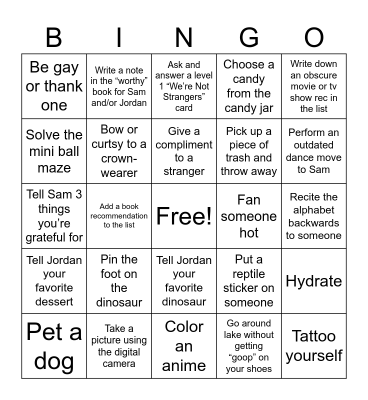 This bingo card has a free space and 24 words: Pin the foot on the dinosaur, Take a picture using the digital camera, Give a compliment to a stranger, Pet a dog, Write down an obscure movie or tv show rec in the list, Be gay or thank one, Solve the mini ball maze, Write a note in the “worthy” book for Sam and/or Jordan, Fan someone hot, Tell Jordan your favorite dinosaur, Pick up a piece of trash and throw away, Tell Sam 3 things you’re grateful for, Put a reptile sticker on someone, Hydrate, Bow or curtsy to a crown-wearer, Go around lake without getting “goop” on your shoes, Recite the alphabet backwards to someone, Ask and answer a level 1 “We’re Not Strangers” card, Perform an outdated dance move to Sam, Add a book recommendation to the list, Tattoo yourself, Tell Jordan your favorite dessert, Choose a candy from the candy jar and Color an anime.