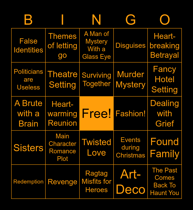 This bingo card has a free space and 24 words: Main Character Romance Plot, Revenge, Surviving Together, Redemption, Heart-breaking Betrayal, False Identities, Politicians are Useless, Themes of letting go, Fashion!, Twisted Love, Murder Mystery, A Brute with a Brain, Events during Christmas, Found Family, Theatre Setting, Art-Deco, Dealing with Grief, A Man of Mystery With a Glass Eye, Fancy Hotel Setting, Heart-warming Reunion, The Past Comes Back To Haunt You, Sisters, Disguises and Ragtag Misfits for Heroes.