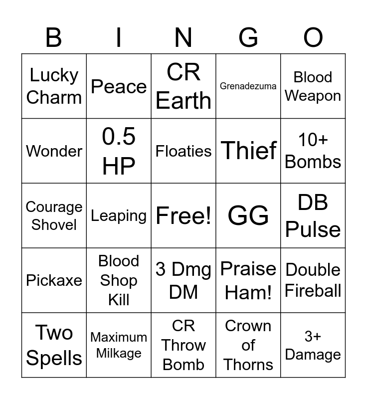 This bingo card has a free space and 53 words: 10 Hearts, 3+ Damage, Potion, Crown of Thorns, Blood Shop Kill, Ring of Regen, Peace, Dragon Lure, Wonder, Heavy Plate, 0.5 HP, Heal Spell, Double Fireball, Praise Ham!, GUN, Two Spells, Floaties, GG, 5+ Spirits on one Floor, Blood Weapon, Leaping, Food Shop, Thief, Lucky Charm, Missed Lucky Charm, Maximum Milkage, Darkness Conjurer, Darkness Transmute, 18+ Cookies, 10+ Bombs, Magic Food, Dead Freddie, Legal Heavy Plate, Earth After CR, Ozuma, Earthzuma, Grenadezuma, CR Throw Bomb, CR Earth, CR Throw Fireball, DB Throw, DB Throw Fireball, DB Pulse, DB Earth, DM Earth, 3 Dmg DM, FM Earth, Throwing Charm, Courage Shovel, Pickaxe, Obsidian Shovel, Trident and Mystery Shrine.