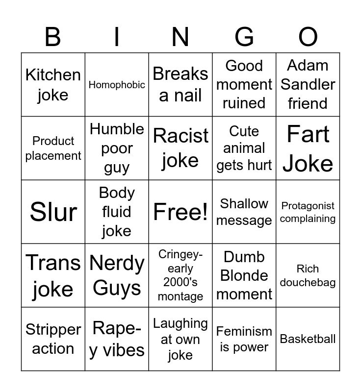 This bingo card has a free space and 24 words: Nerdy Guys, Rape-y vibes, Racist joke, Stripper action, Adam Sandler friend, Kitchen joke, Product placement, Homophobic, Shallow message, Cringey-early 2000's montage, Cute animal gets hurt, Slur, Dumb Blonde moment, Rich douchebag, Humble poor guy, Feminism is power, Protagonist complaining, Breaks a nail, Fart Joke, Body fluid joke, Basketball, Trans joke, Good moment ruined and Laughing at own joke.