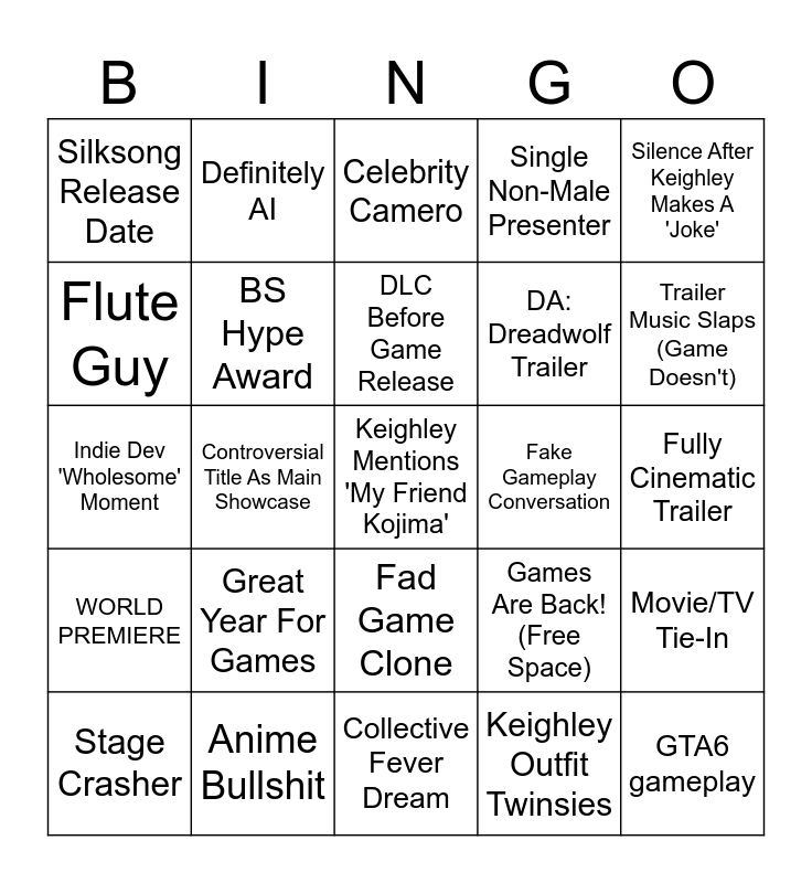 This bingo card has 25 words: Great Year For Games, Collective Fever Dream, DLC Before Game Release, Stage Crasher, Silence After Keighley Makes A 'Joke', Silksong Release Date, Flute Guy, Definitely AI, Fake Gameplay Conversation, Fad Game Clone, DA: Dreadwolf Trailer, Indie Dev 'Wholesome' Moment, Games Are Back! (Free Space), Movie/TV Tie-In, BS Hype Award, GTA6 gameplay, Fully Cinematic Trailer, Celebrity Camero, Trailer Music Slaps (Game Doesn't), Controversial Title As Main Showcase, Keighley Mentions 'My Friend Kojima', Anime Bullshit, WORLD PREMIERE, Single Non-Male Presenter and Keighley Outfit Twinsies.