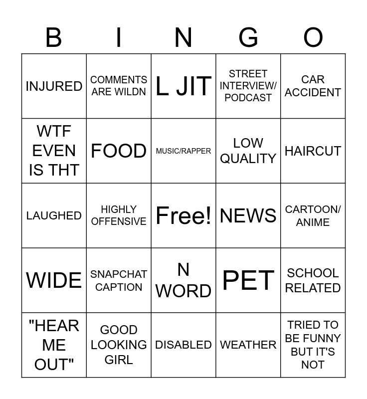 This bingo card has a free space and 24 words: SNAPCHAT CAPTION, GOOD LOOKING GIRL, MUSIC/RAPPER, "HEAR ME OUT", CAR ACCIDENT, INJURED, WTF EVEN IS THT, COMMENTS ARE WILDN, NEWS, N WORD, LOW QUALITY, LAUGHED, PET, SCHOOL RELATED, FOOD, WEATHER, CARTOON/ ANIME, L JIT, HAIRCUT, HIGHLY OFFENSIVE, TRIED TO BE FUNNY BUT IT'S NOT, WIDE, STREET INTERVIEW/ PODCAST and DISABLED.