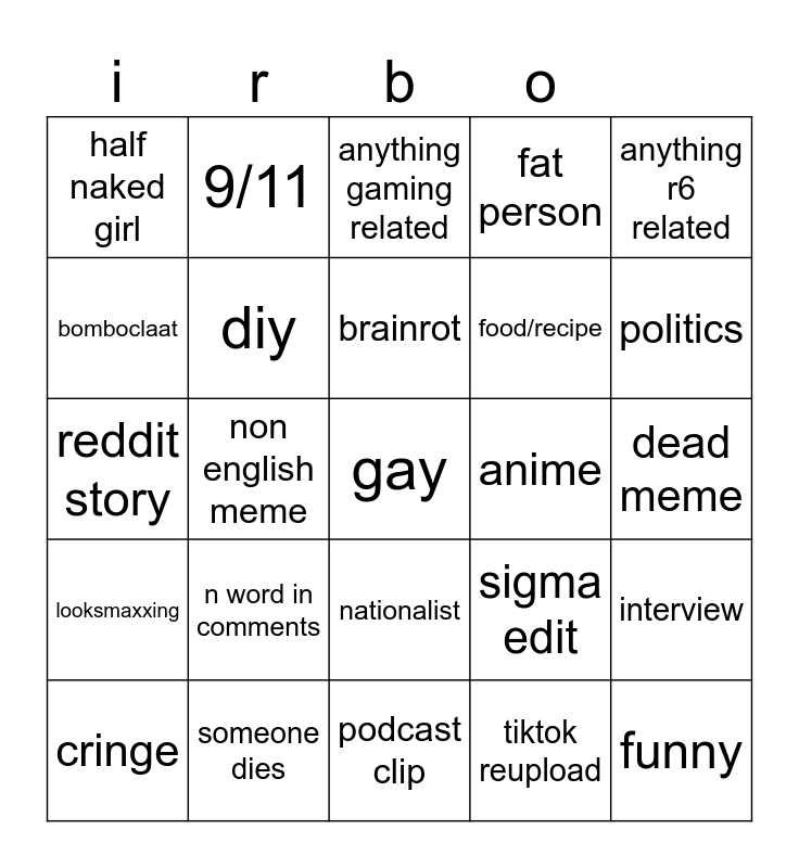 This bingo card has a free space and 24 words: n word in comments, someone dies, brainrot, cringe, anything r6 related, half naked girl, bomboclaat, 9/11, anime, nationalist, food/recipe, reddit story, sigma edit, interview, diy, tiktok reupload, dead meme, anything gaming related, politics, non english meme, funny, looksmaxxing, fat person and podcast clip.