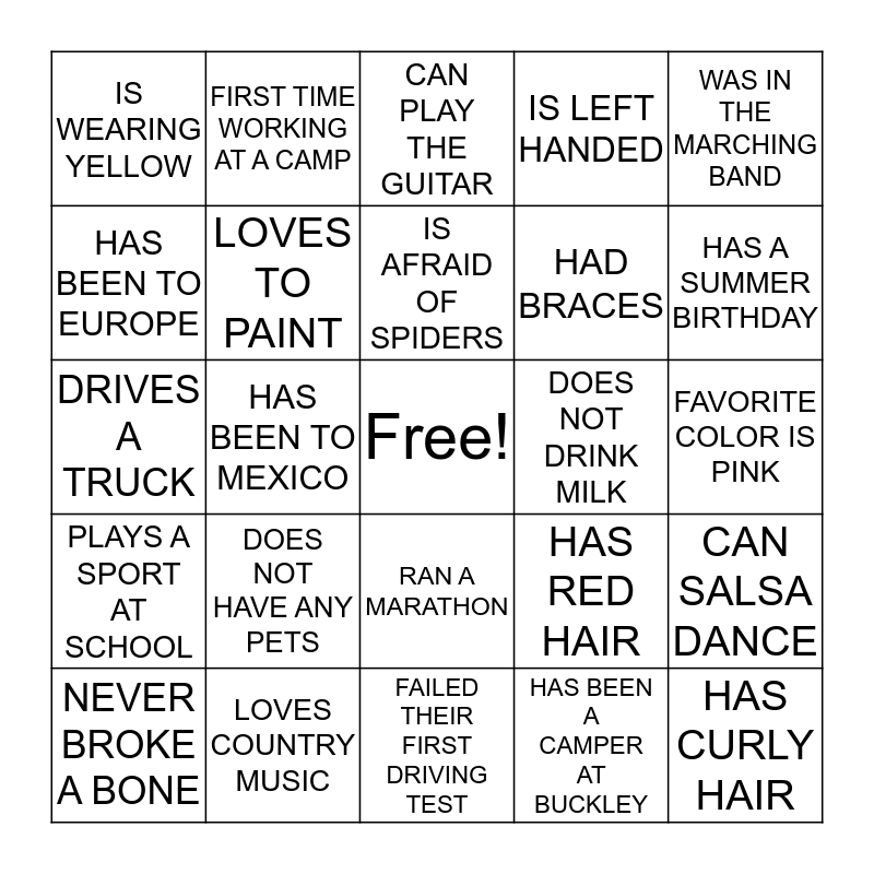 This bingo card has a free space and 24 words: DOES NOT HAVE ANY PETS, LOVES COUNTRY MUSIC, IS AFRAID OF SPIDERS, NEVER BROKE A BONE, WAS IN THE MARCHING BAND, IS WEARING YELLOW, HAS BEEN TO EUROPE, FIRST TIME WORKING AT A CAMP, DOES NOT DRINK MILK, RAN A MARATHON, HAD BRACES, DRIVES A TRUCK, HAS RED HAIR, CAN SALSA DANCE, LOVES TO PAINT, HAS BEEN A CAMPER AT BUCKLEY, FAVORITE COLOR IS PINK, CAN PLAY THE GUITAR, HAS A SUMMER BIRTHDAY, HAS BEEN TO MEXICO, HAS CURLY HAIR, PLAYS A SPORT AT SCHOOL, IS LEFT HANDED and FAILED THEIR FIRST DRIVING TEST.