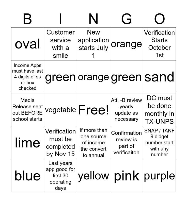 This bingo card has a free space and 24 words: Verification must be completed by Nov 15, Last years app good for first 30 operating days, orange, blue, Verification Starts October 1st, oval, Income Apps must have last 4 digits of ss or box checked, Customer service with a smile, Att. -B review yearly update as necessary, If more than one source of income the convert to annual, green, Media Release sent out BEFORE school starts, Confirmation review is part of verificaiton, SNAP / TANF 9 didget number start with any number, green, pink, DC must be done monthly in TX-UNPS, New application starts July 1, sand, vegetable, purple, lime, orange and yellow.