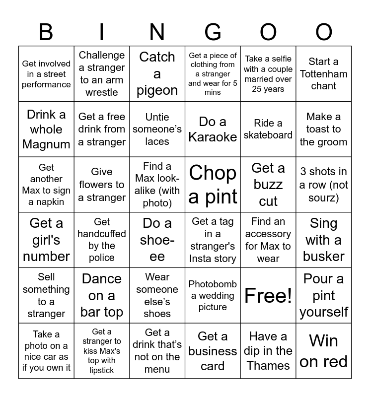 This bingo card has 37 words: Free!, Photobomb a wedding picture, Have a dip in the Thames, Drink a whole Magnum, Get handcuffed by the police, Get a buzz cut, Get a free drink from a stranger, Get a business card, Take a selfie with a couple married over 25 years, Take a photo on a nice car as if you own it, Make a toast to the groom, Get a piece of clothing from a stranger and wear for 5 mins, Get another Max to sign a napkin, Find a Max look-alike (with photo), Start a Tottenham chant, Chop a pint, Dance on a bar top, Catch a pigeon, 3 shots in a row (not sourz), Give flowers to a stranger, Get involved in a street performance, Do a Karaoke, Do a shoe-ee, Find an accessory for Max to wear, Get a stranger to kiss Max's top with lipstick, Sing with a busker, Challenge a stranger to an arm wrestle, Get a drink that’s not on the menu, Pour a pint yourself, Wear someone else’s shoes, Get a stranger to autograph your forehead, Get a tag in a stranger's Insta story, Ride a skateboard, Sell something to a stranger, Get a girl's number, Untie someone’s laces and Win on red.