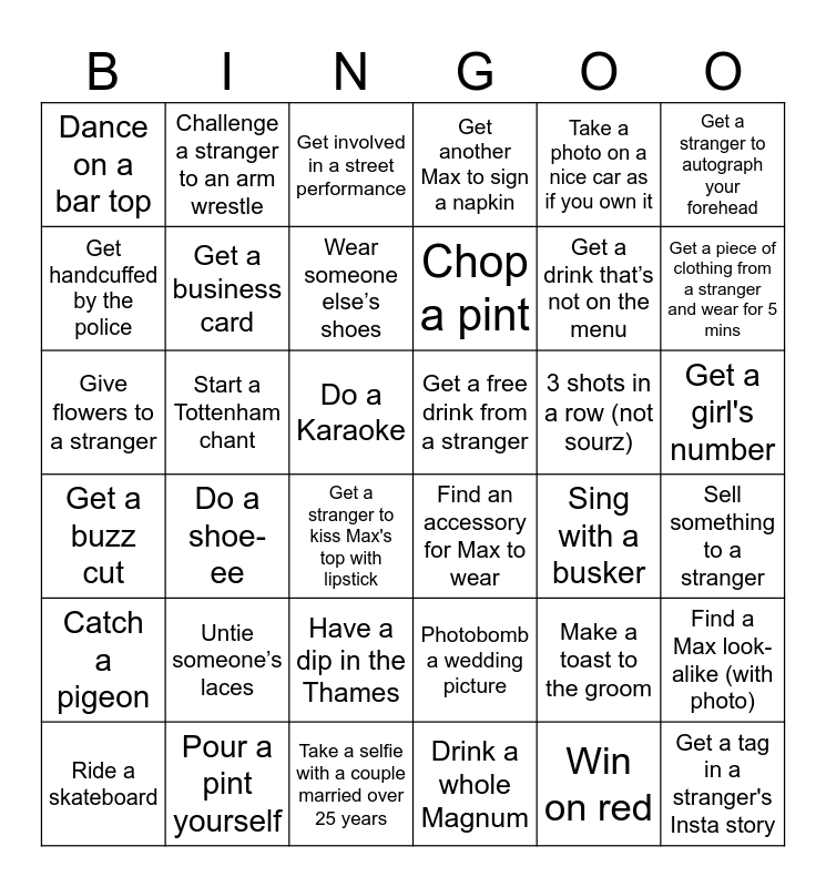 This bingo card has 36 words: Photobomb a wedding picture, Have a dip in the Thames, Drink a whole Magnum, Get handcuffed by the police, Get a buzz cut, Get a free drink from a stranger, Get a business card, Take a selfie with a couple married over 25 years, Take a photo on a nice car as if you own it, Make a toast to the groom, Get a piece of clothing from a stranger and wear for 5 mins, Get another Max to sign a napkin, Find a Max look-alike (with photo), Start a Tottenham chant, Chop a pint, Dance on a bar top, Catch a pigeon, 3 shots in a row (not sourz), Give flowers to a stranger, Get involved in a street performance, Do a Karaoke, Do a shoe-ee, Find an accessory for Max to wear, Get a stranger to kiss Max's top with lipstick, Sing with a busker, Challenge a stranger to an arm wrestle, Get a drink that’s not on the menu, Pour a pint yourself, Wear someone else’s shoes, Get a stranger to autograph your forehead, Get a tag in a stranger's Insta story, Ride a skateboard, Sell something to a stranger, Get a girl's number, Untie someone’s laces and Win on red.