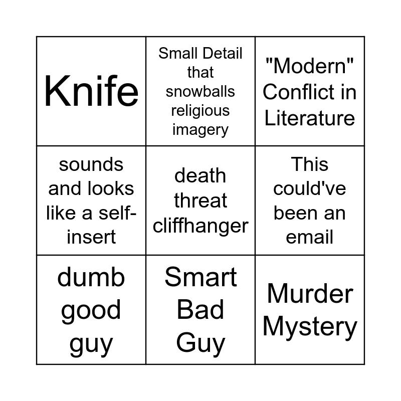 This bingo card has 9 words: dumb good guy, "Modern" Conflict in Literature, Small Detail that snowballs religious imagery, sounds and looks like a self-insert, Knife, This could've been an email, death threat cliffhanger, Murder Mystery and Smart Bad Guy.