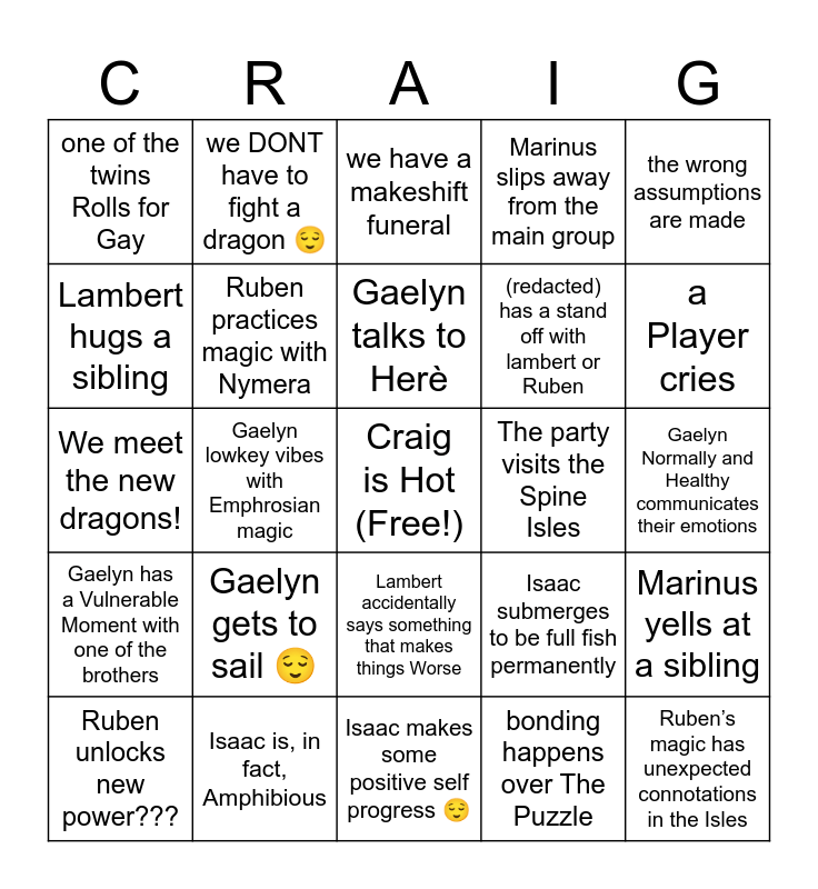 This bingo card has a free space and 49 words: Lambert manages to get the Spine to respect him, Rubenβs magic has unexpected connotations in the Isles, Marinus finally talks about it, Isaac makes some positive self progress π, Gaelyn gets to sail π, The sneak-peak dragons have defected to our side π, we DONT have to fight a dragon π, Lambert talks about the future of Emphros, Lambert hugs a sibling, Ruben draws in his notebook, Ruben practices magic with Nymera, Marinus slips away from the main group, Marinus yells at a sibling, Isaac submerges to be full fish permanently, Isaac attempts to start a conversation with Marinus, Gaelyn and Nymera discuss his new magic, Gaelyn talks to HerΓ¨, The party visits the Spine Isles, The brothers get yelled at by a known NPC for being gone, the wrong assumptions are made, Gaelyn lowkey vibes with Emphrosian magic, bonding happens over The Puzzle, one of the twins Rolls for Gay, (redacted) has a stand off with lambert or Ruben, Twin Swap! (seems unlikely but I'm manifesting lol), a Player cries, Ruben unlocks new power???, Marinus does something self destructive, Lambert accidentally says something that makes things Worse, Gaelyn has a Vulnerable Moment with one of the brothers, Isaac is separated from HerΓ¨, Lambert gets to be King to Emphrosians at the Spine, Ruben doesn't want to leave the Spine, Marinus smokes a Weed, Isaac is, in fact, Amphibious, Gaelyn helps out Emphrosian Refugees, +3 significant NPCs DEAD, the NEW dragons attacked the Spine, Gaelyn Normally and Healthy communicates their emotions, Twinswap does not change things with Nymera, Twinswap all the way down, Marinus keeps digging, Isaac finds new and exciting trauma!, Oops we missed a boss fight on the surface!, We meet the new dragons!, we have a makeshift funeral, dad is DEAD, mom is MISSING and cliffhanger when we reach the surface.