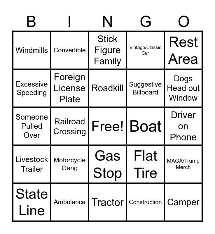 This bingo card has a free space and 29 words: State Line, Horn is Honked, Railroad Crossing, Livestock in Field, Windmills, Stick Figure Family, Foreign License Plate, Motorcycle Gang, Boat, Ambulance, Driver on Phone, Camper, Tractor, Construction, Dogs Head out Window, Bachelorette Venmo Recieved, Gas Stop, Livestock Trailer, Rest Area, Someone Pulled Over, Flat Tire, Fire Hydrant, Suggestive Billboard, Excessive Speeding, Vintage/Classic Car, Convertible, MAGA/Trump Merch, Roadkill and Birds on a Wire.