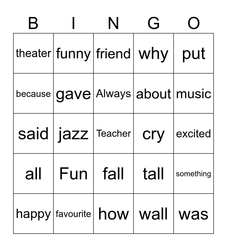 This bingo card has a free space and 24 words: Fun, favourite, Always, happy, put, theater, because, funny, cry, fall, about, said, tall, something, gave, wall, excited, friend, music, jazz, was, all, why and how.