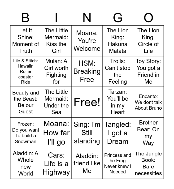 This bingo card has a free space and 24 words: Moana: How far I’ll go, Cars: Life is a Highway, HSM: Breaking Free, Aladdin: A Whole new World, The Lion King: Circle of Life, Let It Shine: Moment of Truth, Lilo & Stitch: Hawaiin Roller coaster Ride, The Little Mermaid: Kiss the Girl, Tarzan: You’ll be in my Heart, Sing: I’m Still standing, Trolls: Can’t stop the Feeling, Beauty and the Beast: Be our Guest, Tangled: I got a Dream, Brother Bear: On my Way, Mulan: A Girl worth Fighting for, Princess and the Frog: Never knew I Needed, Encanto: We dont talk About Bruno, Moana: You’re Welcome, Toy Story: You got a Friend in Me, The Little Mermaid: Under the Sea, The Jungle Book: Bare necessities, Frozen: Do you want To build a Snowman, The Lion King: Hakuna Matata and Aladdin: friend like Me.