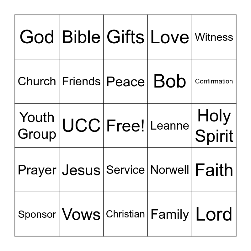 This bingo card has a free space and 24 words: Jesus, Vows, Peace, Sponsor, Witness, God, Church, Bible, Leanne, Service, Bob, Youth Group, Norwell, Faith, Friends, Family, Holy Spirit, Gifts, Confirmation, UCC, Lord, Prayer, Love and Christian.
