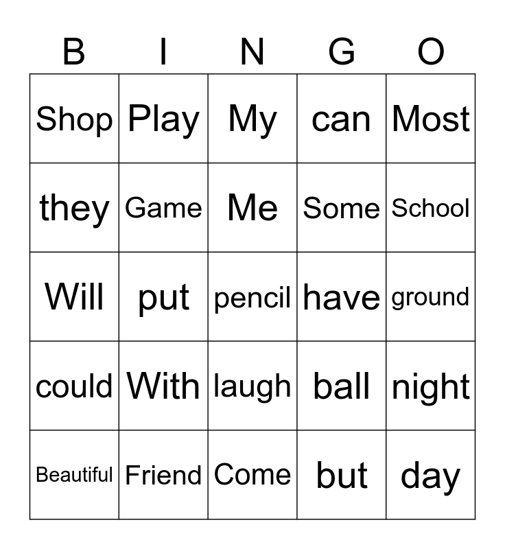 This bingo card has a free space and 24 words: With, Friend, Me, Beautiful, Most, Shop, they, Play, have, laugh, Some, Will, ball, night, Game, but, ground, My, School, put, day, could, can and Come.