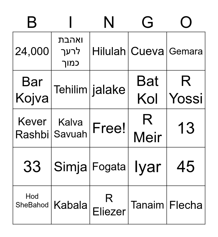 This bingo card has a free space and 54 words: Rashbi, 33, Lag Baomer, Sefirat Haomer, Fogata, Carob, Cueva, Zohar, Bar Kojva, Rabbi Akiva, 24,000, Rajel, Kabala, Hod SheBahod, Romanos, R Eliezer, Flecha, Bat Kol, Torah, 13, Iyar, Plaga, R Meir, Gemara, Sheli Veshelachem, ואהבת לרעך כמוך, Jerusalem de Oro, Debería afeitarme?, 49, Tanaim, Ahavat Jinam, Sinat Jinam, Shelo Nahago Kavod Ze Baze, Rabbi Shimon Bar Yochai, Hilulah, Meron, Kever Rashbi, 45, Velas, Tehilim, Tefila, Musica, Jol Hamoed, Marshmelow, Simja, Marriage, Tzipori, Shavuot, jalake, Kalva Savuah, R Yossi, Kavod, Fuego and Galil.